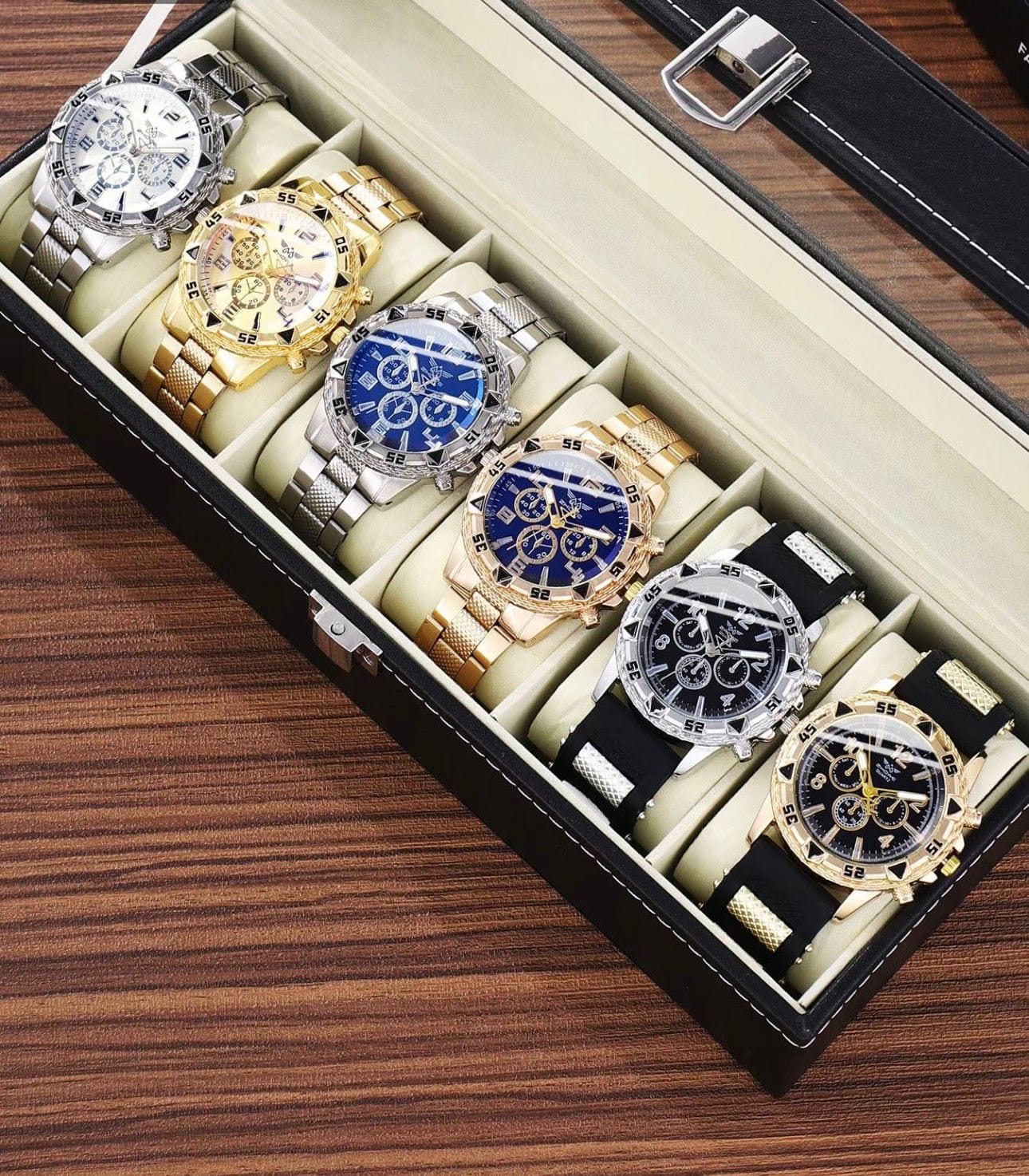 6Pcs/Set Men's Watch Set Fashion Leisure Classic Three Eye Digital Scale Circular Dial Quartz Watch Set Holiday Gift (With gift